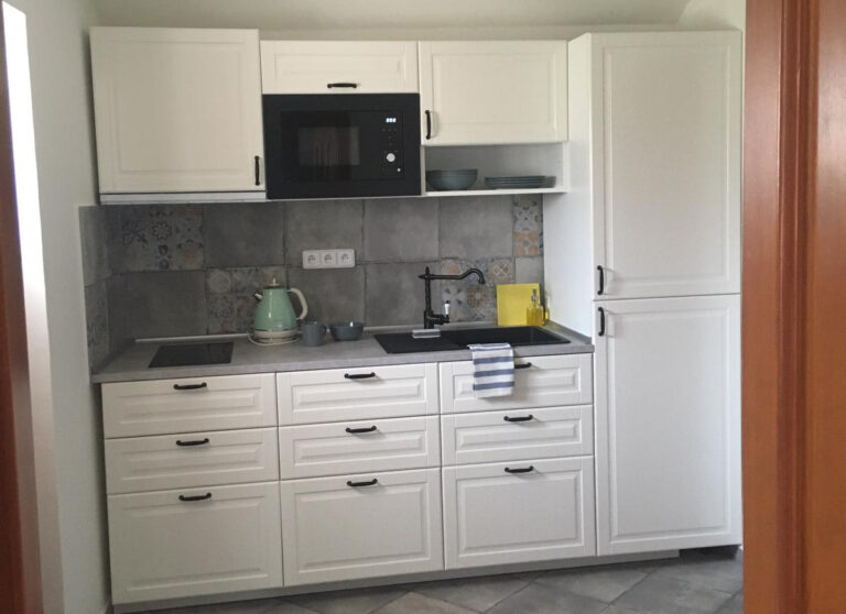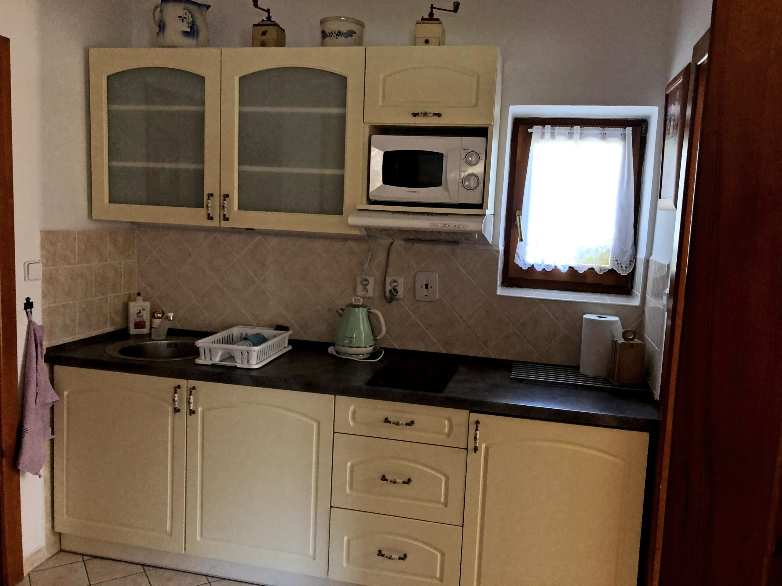 Apartmán pro 2-3 osoby má vstupní chodbičku s kuchyňkou vybavenou sklokeramickou deskou, mikrovlnnou troubou, varnou konvicí, veškerým nádobím a mycími potřebami. V pokoji je manželská postel (200x180) a jednolůžko (200x80). Koupelna se dvěma umyvadly z umělého kamene, sprchovým koutem, WC, fénem na vlasy a toaletními potřebami.
