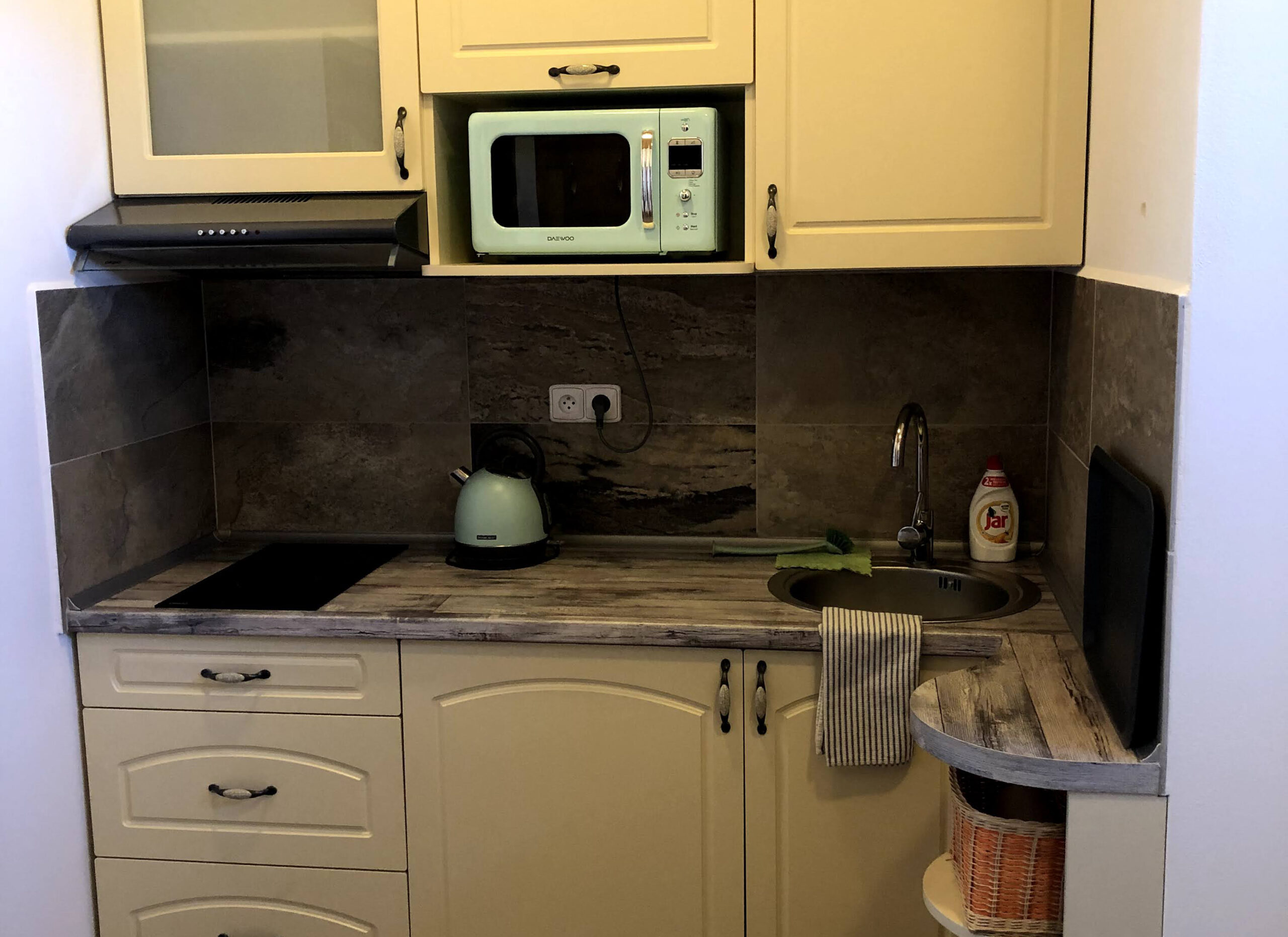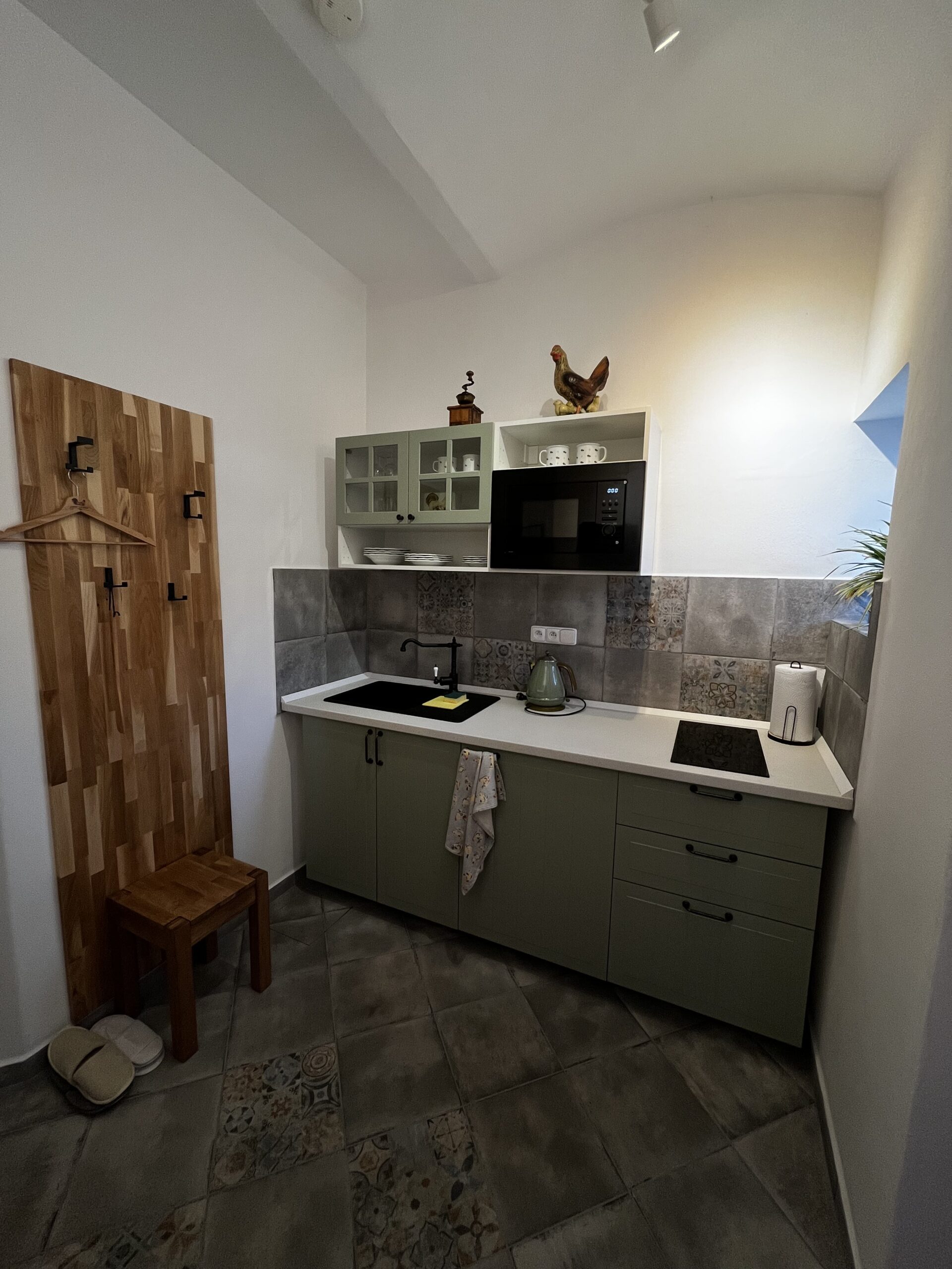 Apartmán pro 2 osoby se vstupní chodbičkou ve které je kuchyňská linka (sklokeramická deska, vestavěná mikrovlnná trouba, chladnička, rychlovarná konvice, kuchyňské potřeby, nádobí). Koupelna s prostorným sprchovým koutem, WC, fén na vlasy, toaletní a hygienické potřeby, ručníky, osušky. V pokoji je pohodlná manželská postel.
