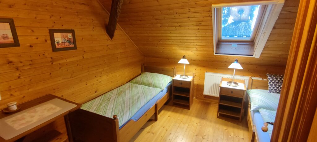 Rodinný apartmán pro 4 osoby má vstupní chodbičku, která slouží jako šatna na odložení oblečení a obuvi. Dále kuchyňku s ledničkou, sklokeramickou deskou, mikrovlnnou troubou, varnou konvicí v retro stylu, veškerým nádobím a mycími potřebami. Apartmá se skládá ze dvou oddělených pokojů, celkem pro 4 osoby. V jedné ložnici je masivní dubová manželská postel (180x200), ve druhé dvě oddělené. Všechny postele jsou vybaveny komfortními matracemi pro vaše pohodlí. Koupelna se sprchovým koutem, WC, fén na vlasy a toaletní potřeby.